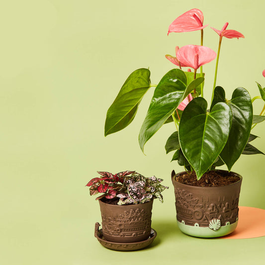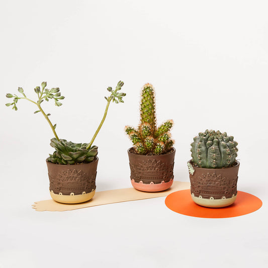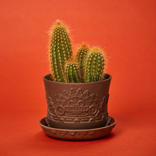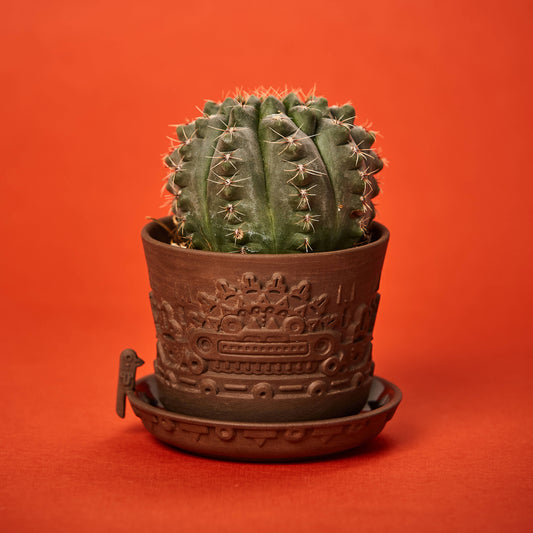 Die Pflanzgefäß-Serie Manoa II ist inspiriert von der Bildsprache der Hochkulturen Mesoamerikas, vergessen und überwuchert vom Dschungel.